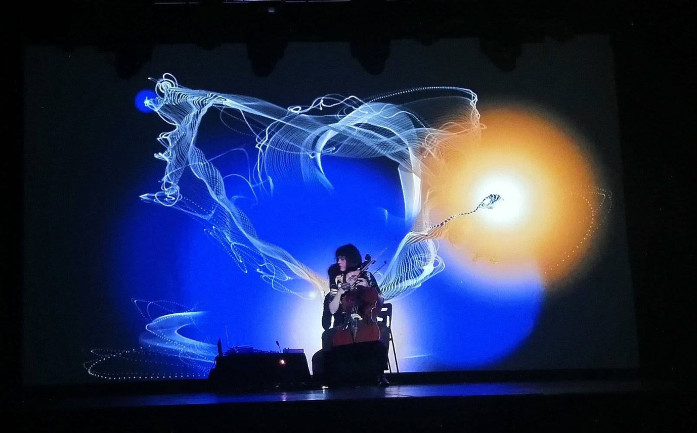 They create a dialogue between visual atmospheres projected on the body of the cellist and her instrument, and the sound performed with the cello and processed with pedals. The visuals of Alba G Corral integrate real-time coding and drawing in real time, creating a narrative atmosphere thanks to the experimentation with digital forms and sound waves in an attempt to narrate the nature forms through the audiovisual.